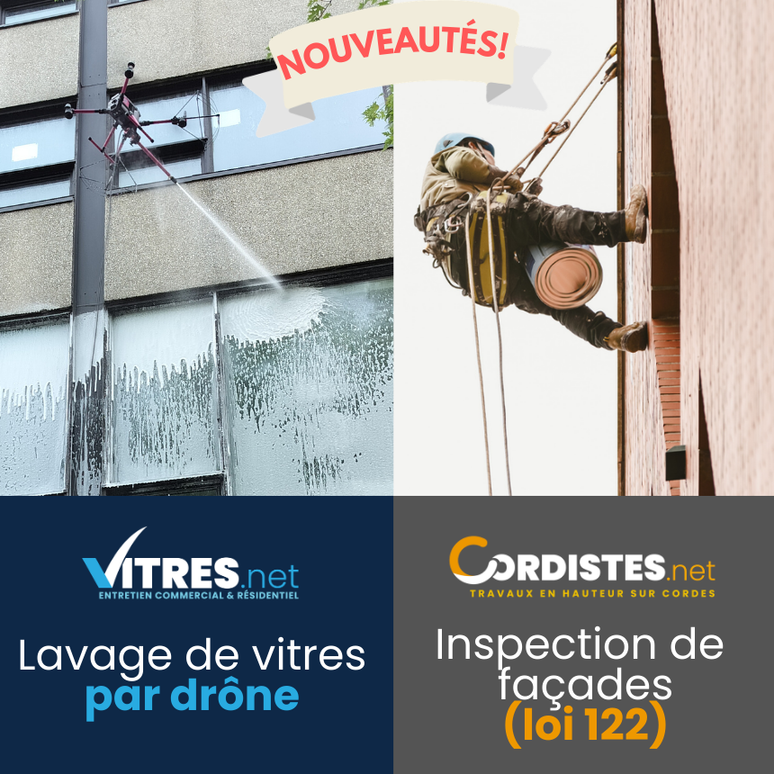 Nous annonçons aussi l’arrivée de Cordistes.net, notre nouvelle division spécialisée en travaux sur cordes, offrant notamment l’inspection de façades conforme à la Loi 122 du Code du bâtiment.